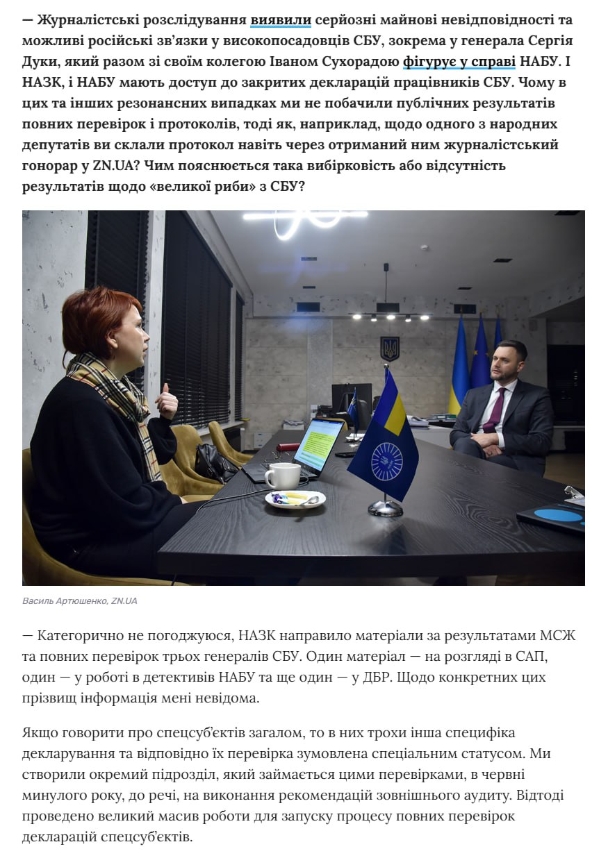 ⁉️Журналістка ZN.UA поставила запитання голові НАЗК Віктору Павлущику про відсутність результатів щодо високопосадовців СБУ, зокрема генерала Сергія Дуки та Івана Сухоради. Павлущик відповів: “НАЗК направило матеріали за результатами МСЖ та повних перевірок трьох генералів СБУ. Один матеріал — на розгляді в САП, один — у роботі в детективів НАБУ та ще один — у ДБР. Щодо конкретних цих прізвищ інформація мені невідома”.