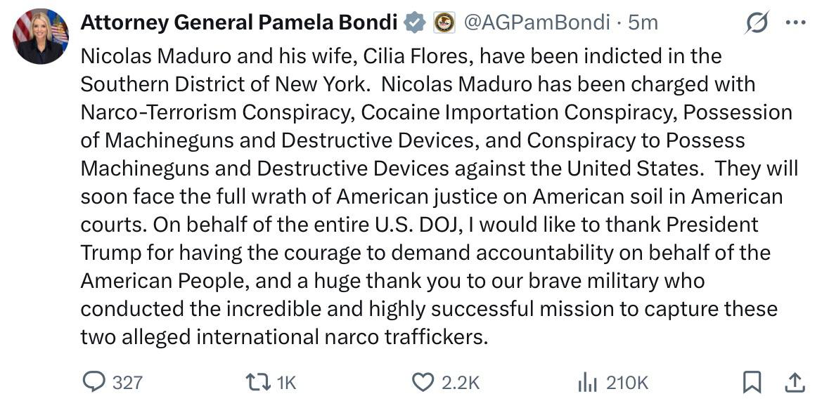 Мадуро та його дружині висунули обвинувачення у «наркотероризмі». Найближчим часом вони постануть перед судом, — генпрокурор США