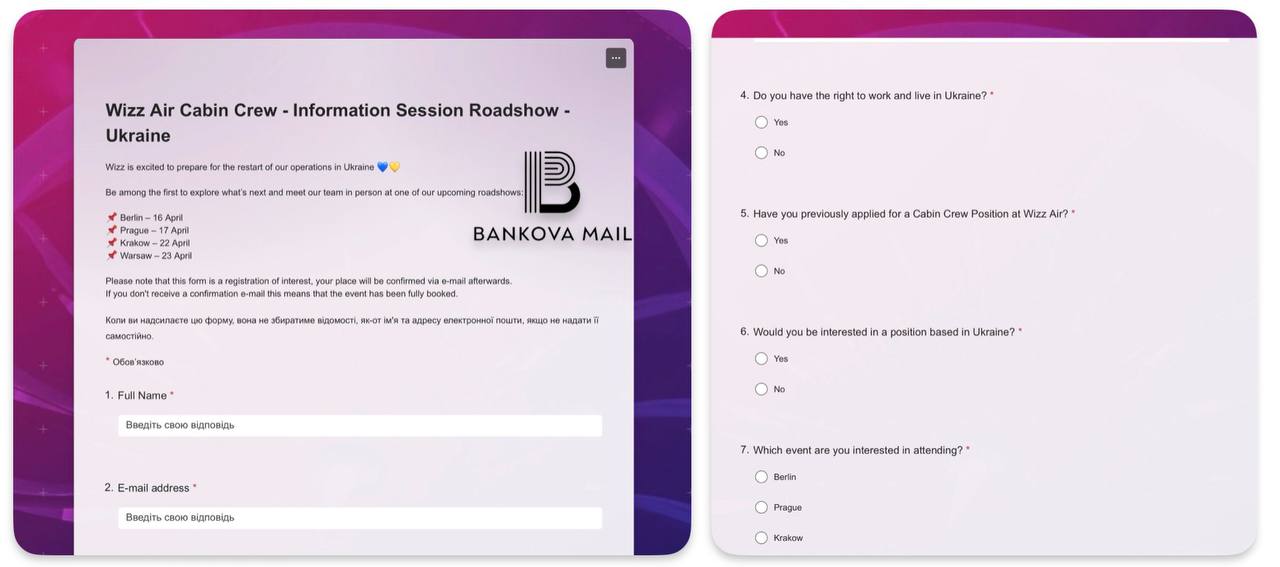 Від офіційних сторінок Wizzair поширюється реклама, в якій йдеться про повернення авіакомпанії в Україну і прикріплене посилання з реєстрацією на набір в команду екіпажу. В анкеті йдеться про найближчі рекрутаційні заходи в Берліні, Празі, Кракові та Варшаві, заплановані на квітень. Також серед запитань – чи має респондент право на роботу в Україні та чи бажає працювати саме тут.