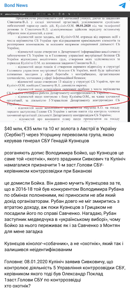 Блогер Володимир Бондаренко заявив, що через Угорщину перевозили $40 млн, €35 млн і 10 кг золота з Австрії в Україну. За його словами, перевезення здійснювала група, яку очолював генерал СБУ Геннадій Кузнєцов.
