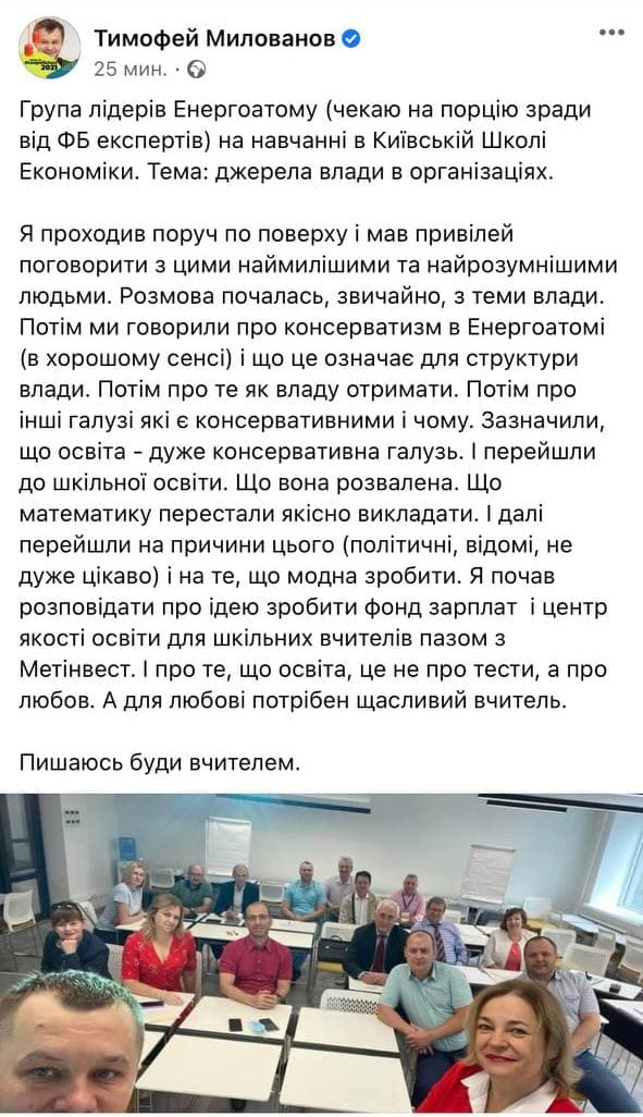 Нардеп Олексій Гончаренко опублікував скріншот допису Тимофія Милованова та написав: “А знаєте скільки коштувало навчити топів Енергоатому в Київській школі економіки? В 2021-му році 8 МІЛЬЙОНІВ ГРИВЕНЬ”.