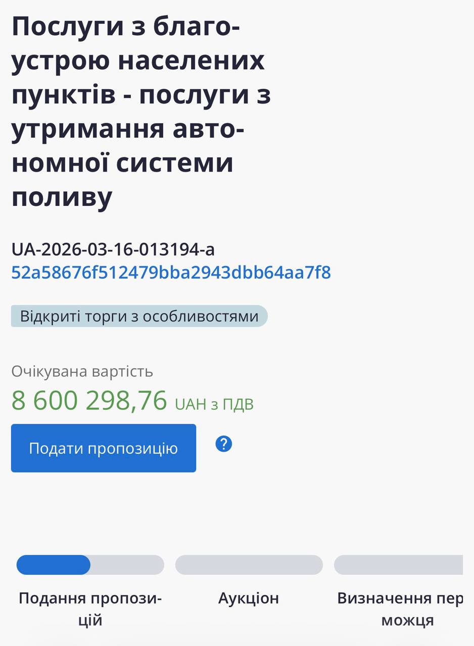 Це – друга спроба провести у 2026 році тендер на утримання автономної системи поливу. Перша була 5 березня 2026 року, тоді у торгах взяла участь лише одна компанія – ТОВ «Автоматичні системи поливу та обладнання Дніпро». Пропозицію компанії відхилили через невідповідність умовам технічної специфікації та іншим вимогам щодо предмета закупівлі.