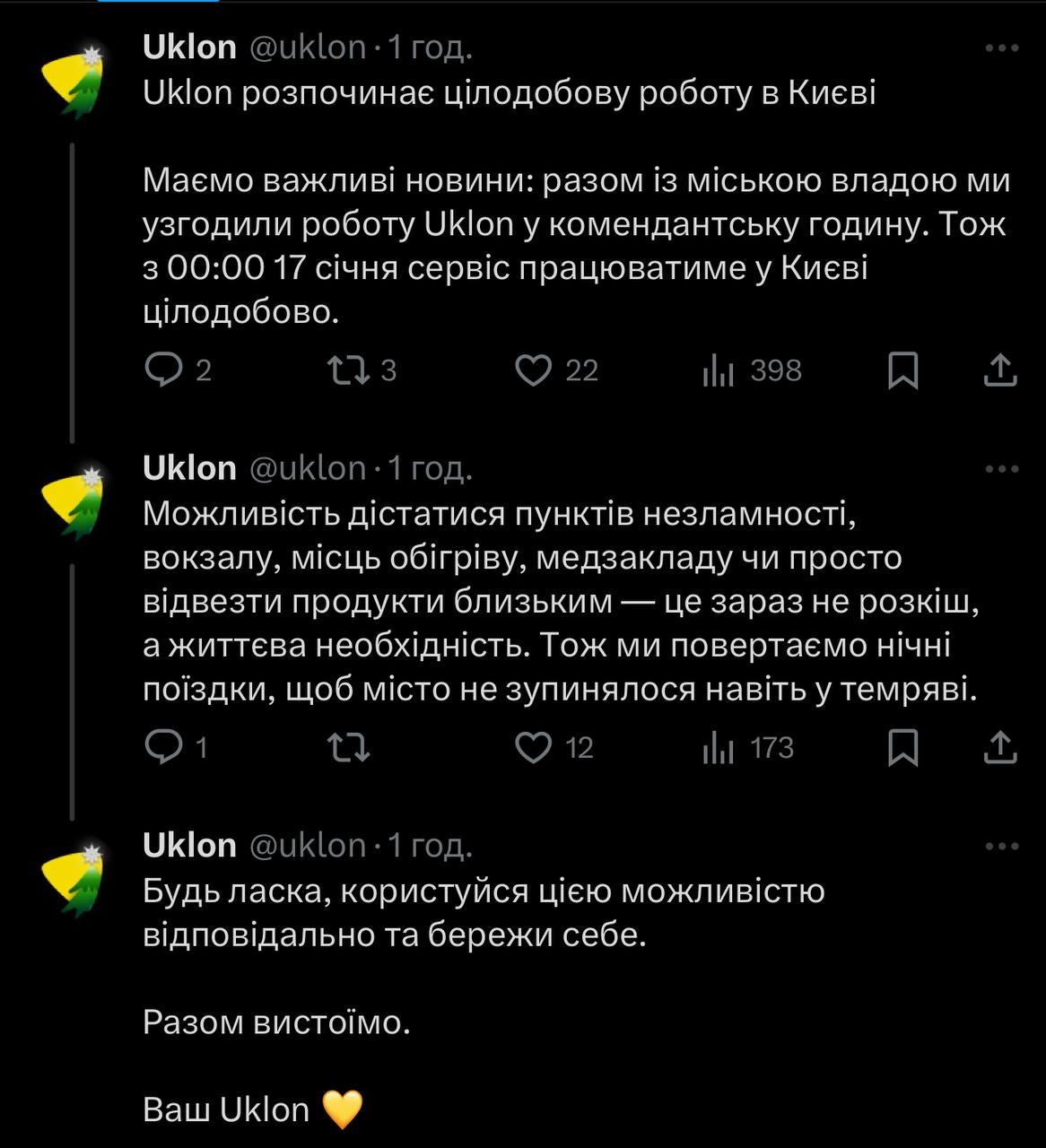 Сервіси таксі Bolt та Uklon повідомили, що працюватимуть в Києві під час комендантської години, цілодобову роботу розпочнуть з 00:00 17 січня