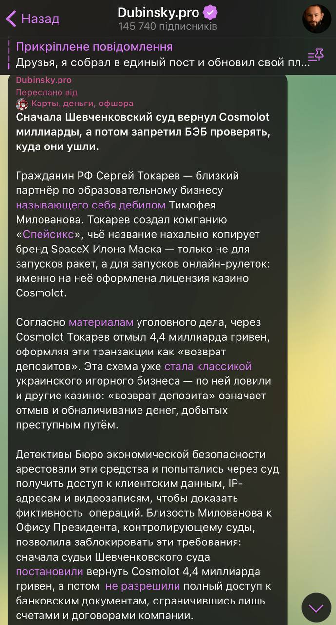 Ті хто зараз опікується тг-каналами Дубінсокого який сидить в СІЗО за підозрою у держзраді розганяють історію про «Cosmolot» Як пишуть на каналах Дубінського, Шевченківський суд повернув «Cosmolot» 4,4 млрд грн, мовляв, таким чином росіянин Токарєв відмив кошти оформлюючи транзакції як «повернення депозитів». Детективи БЕБ арештували ці кошти та намагалися через суд отримати доступ до клієнтських даних, IP-адрес та відеозаписів, щоб довести фіктивність операцій. «Близькість Мілованова до Офісу Президента, який контролює суди, дозволила заблокувати ці вимоги: спочатку судді Шевченківського суду постановили повернути Cosmolot 4,4 мільярда гривень, а згодом не дозволили повний доступ до банківських документів, обмежившись лише рахунками та договорами компанії.»