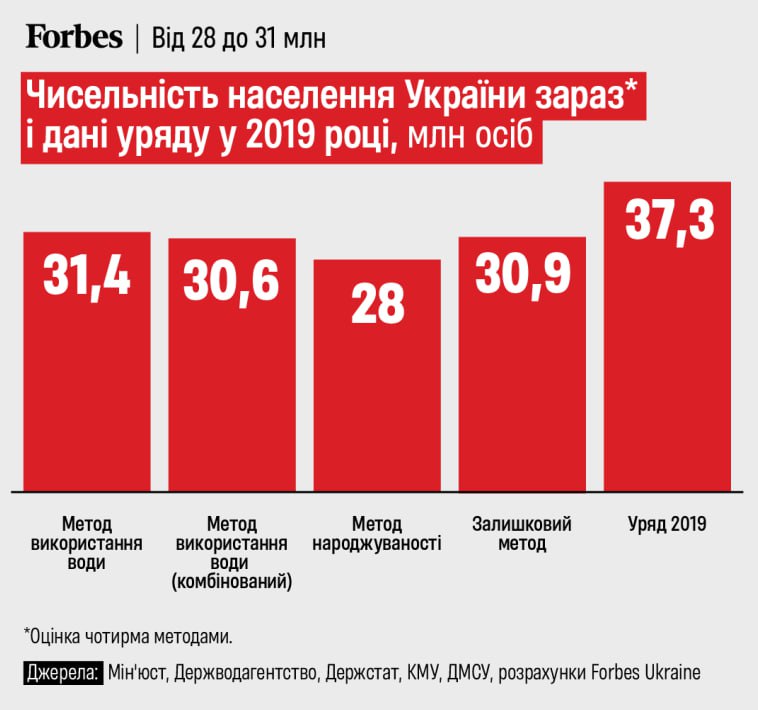 За оцінкою Forbes Ukraine, на підконтрольній уряду території станом на 2025 рік проживає 30,5 млн осіб. Для розрахунку аналітики використали чотири методи: споживання води, комбіновану водяну модель, коефіцієнт народжуваності та класичну залишкову оцінку. Тепер 50% громадян мешкають значно ближче до західних кордонів України.