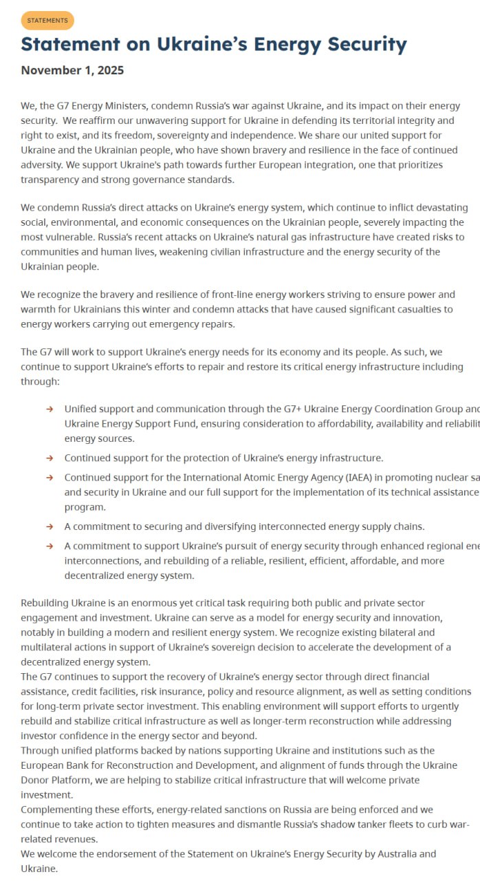 ️G7 підтвердила довгострокову підтримку енергетичної безпеки України: продовження роботи Фонду енергетичної підтримки, координації G7+ і санкцій проти “тіньового флоту” Міністри енергетики країн “Великої сімки” 1 листопада ухвалили спільну заяву. У документі зазначено, що G7 продовжить фінансування ремонтів критичної інфраструктури через групу G7+ Ukraine Energy Coordination Group та Фонд енергетичної підтримки України. ️Окремо підтверджено підтримку МАГАТЕ: впровадження технічної допомоги та гарантування ядерної безпеки в Україні. G7 також пообіцяла допомогу у диверсифікації постачань енергоносіїв та розвитку децентралізованої енергосистеми. Міністри оголосили, допомога вимагатиме залучення державних і приватних інвестицій: пряме фінансування, кредити, страхування ризиків і сприятливі умови для довгострокових інвесторів. Енергетичні санкції проти Росії будуть посилюватися шляхом демонтажу “тіньового флоту” РФ.